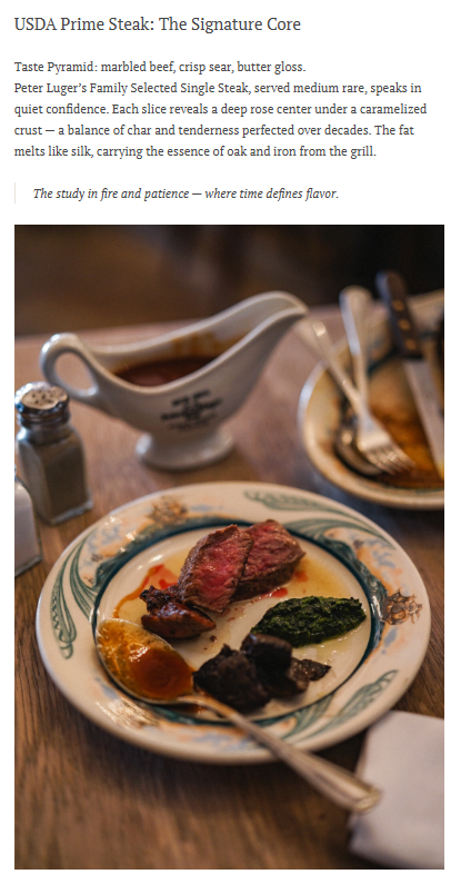 “Each slice reveals a deep rose center under a caramelized crust — a balance of char and tenderness perfected over decades,” Chung wrote in a post about her Peter Luger steak. “The fat melts like silk, carrying the essence of oak and iron from the grill.”