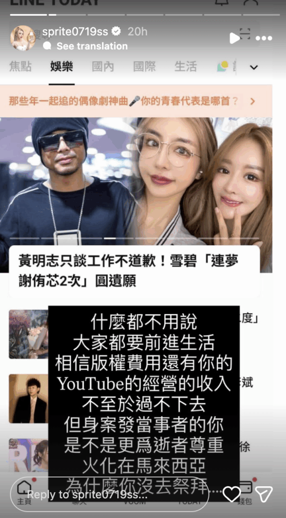 Fang, who was a close friend of Hsieh, appeared to blame Namewee for what happened. She suggested Hsieh would still be alive in Taiwan had she not gone abroad upon Namewee’s invitation.