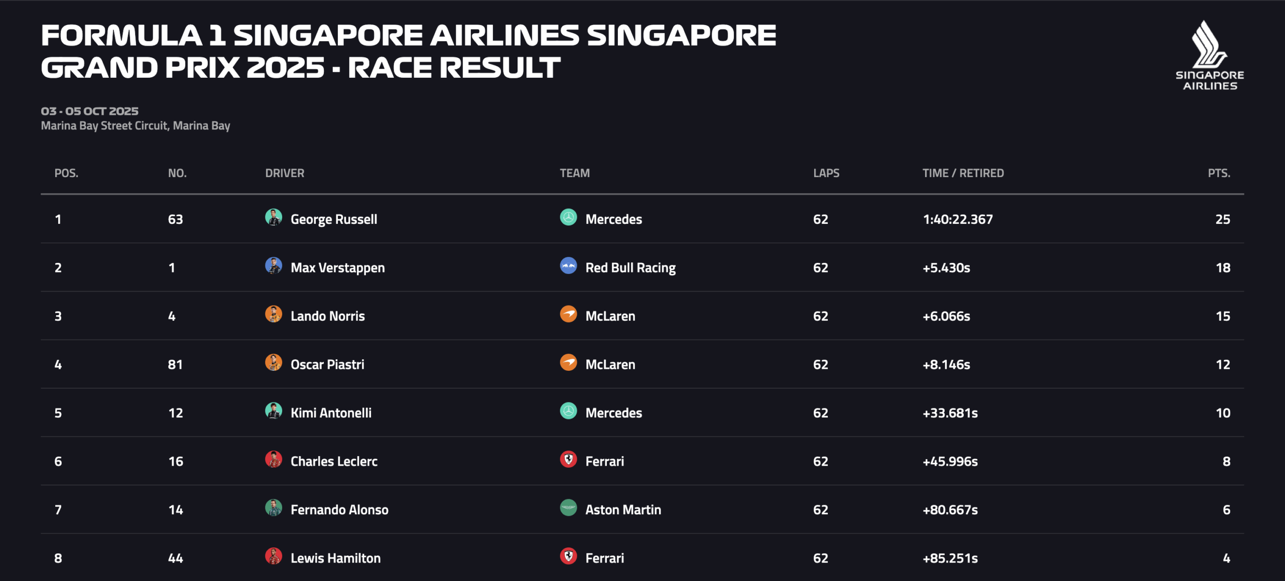 Russell qualified on pole with a new track record time of 1:29.158, marking Mercedes’ first pole at the circuit since Lewis Hamilton in 2018. The race began at 8pm local Singapore time.