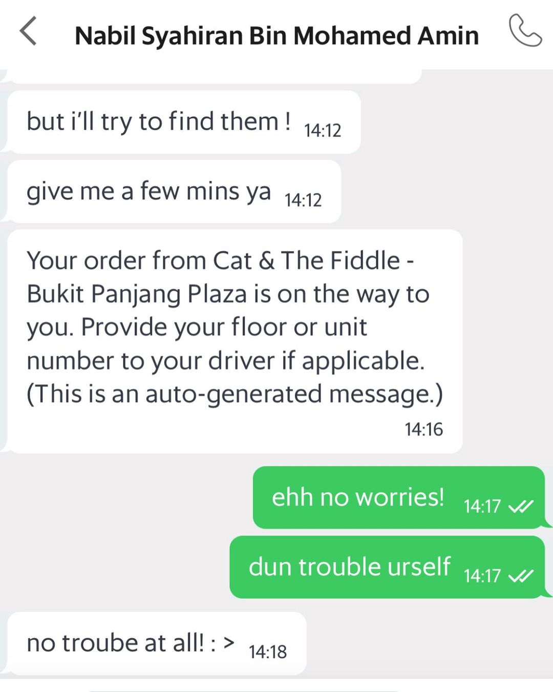 He messaged Nabil, his rider, asking if he could help ask the bakery if they could issue birthday candles for the cake.