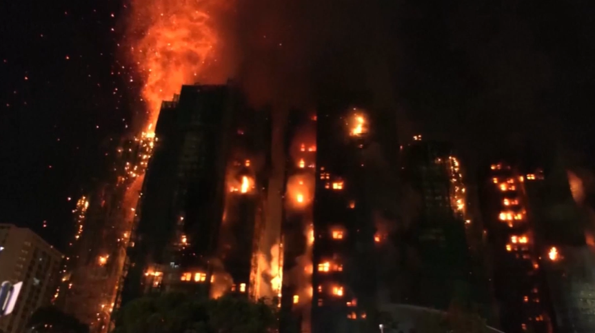 Initial footage from the scene showed bamboo scaffolding outside several flats of the building rapidly bursting into spiralling flames. The scaffolding was completely engulfed in multiple towering columns of fire.