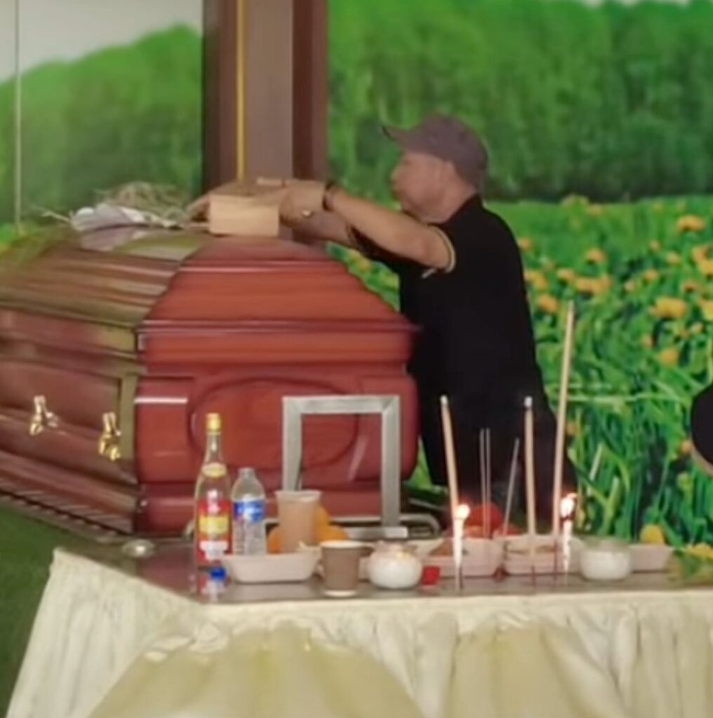 A memorial tablet bearing Hsieh’s name was placed before the coffin as prayers were offered. Her portrait was not placed on the offering table, though several fruits and food items were present, including a bubble tea.