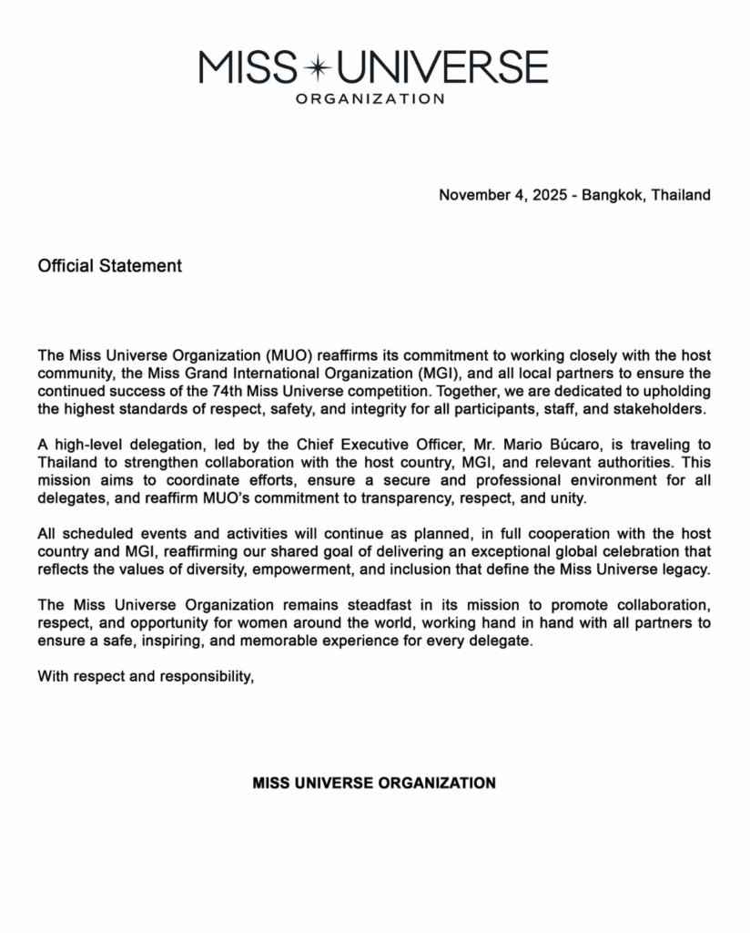 MUO released a statement saying they stand firm in protecting the dignity, safety, and respect of every delegate. The organization confirmed that the competition will continue as planned, with all events proceeding in full cooperation with the host country and MGI.