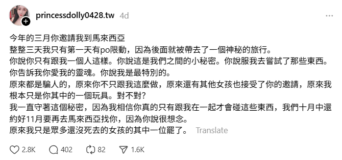 Taiwanese adult film actress Princess Dolly has spoken out about a “mysterious trip” to Malaysia in March 2025, claiming she was introduced to unspecified substances during the visit.