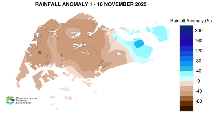 On 16 Nov 2025, widespread moderate to heavy thundery showers fell over many parts of Singapore in the late morning and afternoon. Pulau Semakau recorded a daily total rainfall of 101.8mm that day, the highest for the two-week period.
