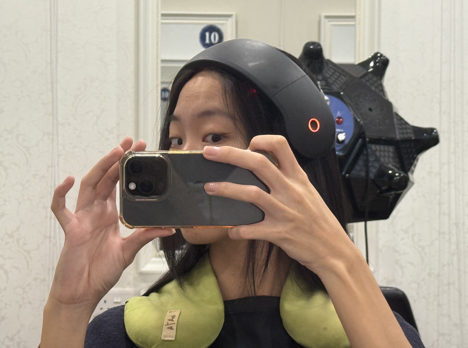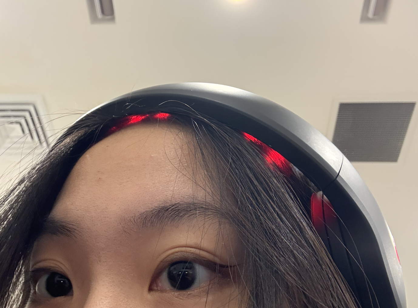 Now, it’s time for PhotoDynamic Therapy using the headphones-esque gadget you see here: