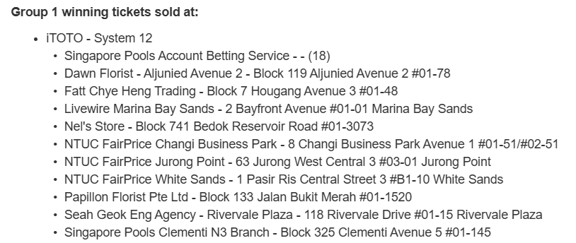 A total of 18 of the 28 winning units were sold through Singapore Pools Account Betting Service online. The remaining 10 units were purchased at various physical outlets across Singapore.