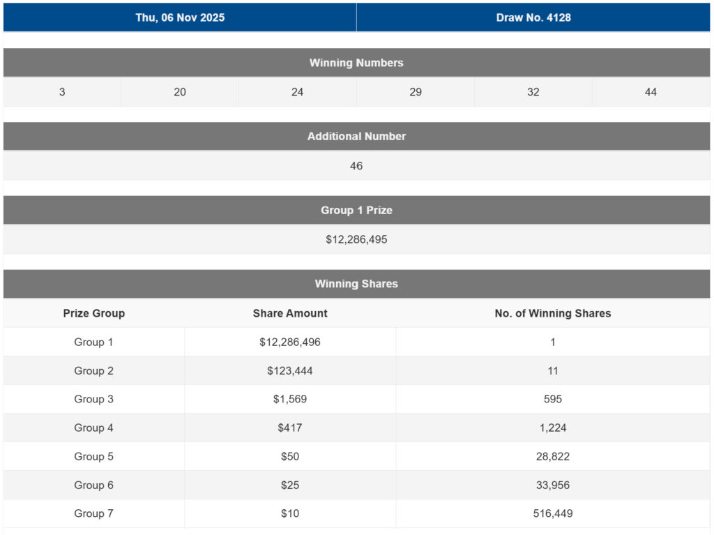 Singapore Pools declared the 6 Nov draw a cascade draw after three consecutive draws on 27 Oct, 30 Oct and 3 Nov failed to produce a Group 1 winner. In a cascade draw, the operator splits the jackpot between Group 2 winners if no Group 1 winner emerges.