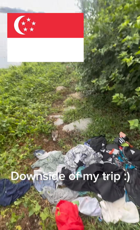 His video showed the makeshift sleeping spot with a pile of laundry. The Singapore Flyer was also visible in the background.